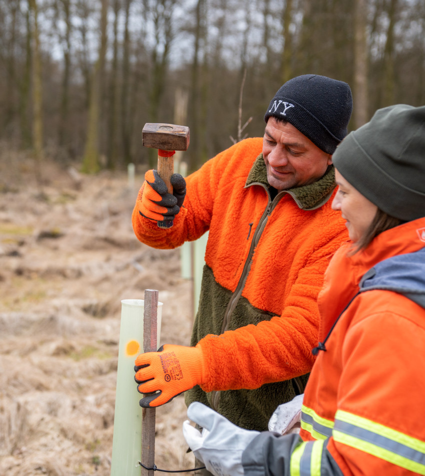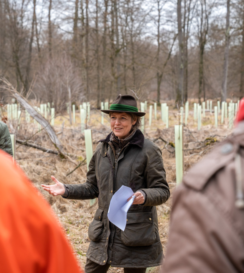 „Wir Förster arbeiten immer für die nachfolgenden Generationen vor“, bestätigte Diplom-Forstingenieurin und Revierleiterin Gabriele Schappacher-Peter. Sie war mit vier Mitarbeitern da, um die Pflanzaktion anzuleiten: „Je diverser Struktur und Schichtung im Forst sind, desto besser“, erklärte sie. Man könne sich den Wald vorstellen wie ein Haus mit verschiedenen Stockwerken: „Heute pflanzen wir unter anderem Haselsträucher. Die gehören mit zum ersten Stockwerk: der Strauchschicht. Das zweite Stockwerk bilden die Bäume. Wir setzen Stileichen, Flatterulmen, Hainbuchen und Nussbäume.“ Alle Arten bereichern den Wald auf unterschiedliche Weise: „Die Äste der Hainbuche zum Beispiel beschatten den Boden und wirken der Vergrasung entgegen.“ Andere Bäume seien ein besonders beliebter Lebensraum bei Vögeln und Insekten: „Die Pappel haben wir auch dabei. Sie wird höher als andere Bäume und ist so ein zusätzliches Stockwerk. Das bietet den Waldbewohnern weitere ökologische Nischen.“